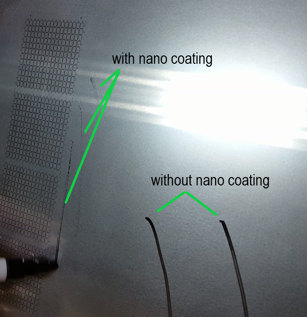 Notice the pen-ink being repelled by the area with nano coating (the ink beads up).